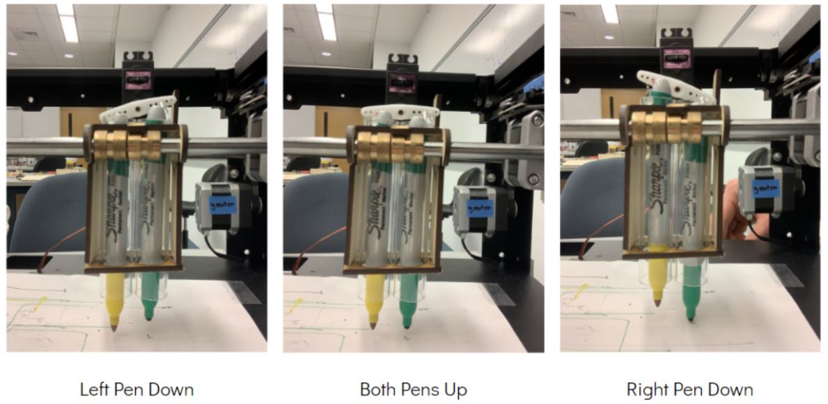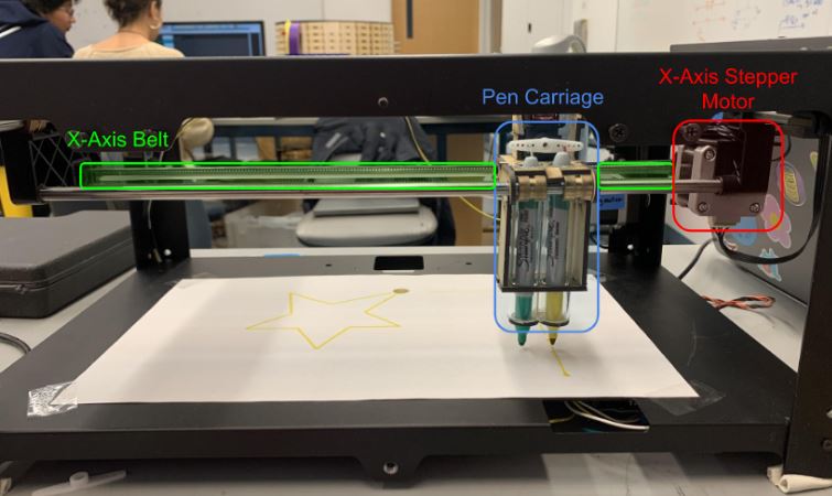 We modified the Makerbot gantry frame by cutting the sides down and drilling new screw holes for reassembly. We also removed the Z-axis stepper motor and build plate since we did not need them. The x-axis motor is connected to the x-axis belt. The pen carriage is attached to one side of the belt so that when the belt moves, the pen carriage with it.