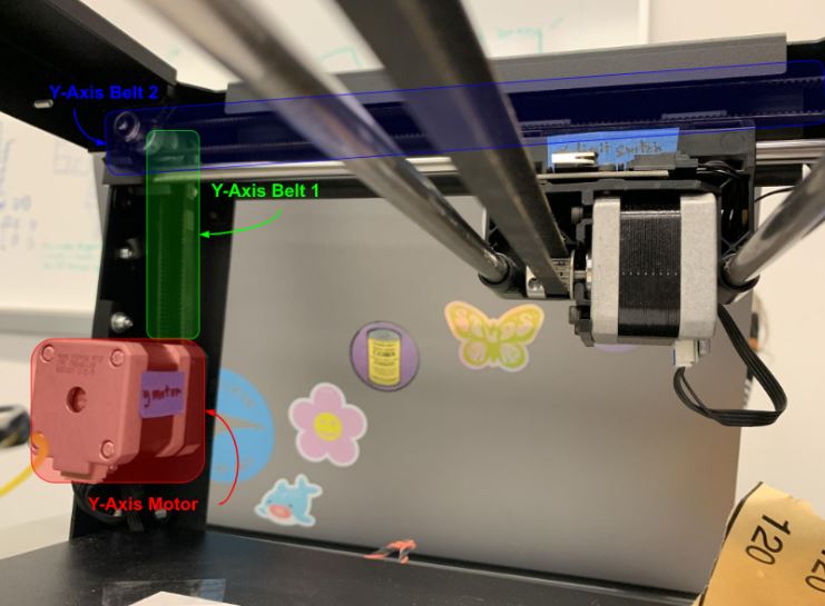 The y-axis motor is connected to the y-axis belt 1. Y-axis belt 1 spins the shaft that y-axis belt 2 is attached to. The x-axis assembly is on rails and connected to y-axis belt 2, so when belt 2 moves the x-axis assembly moves with it. This setup allows our gantry to draw continuous curves in any direction.