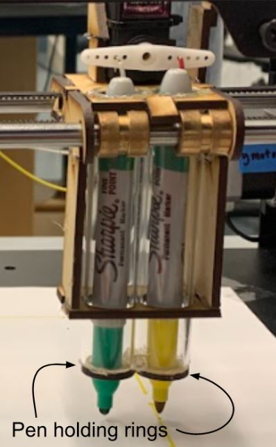 The pen carriage is designed to house 2 pens and a servo. When the servo turns one pen is lifted and the other is pressed to the paper. The pens are housed in clear tubes with small pen holding rings at the end of the tubes. The rings keep the pens from moving while the bot is drawing. The carriage was designed to slide on the bearings that were already on the gantry.